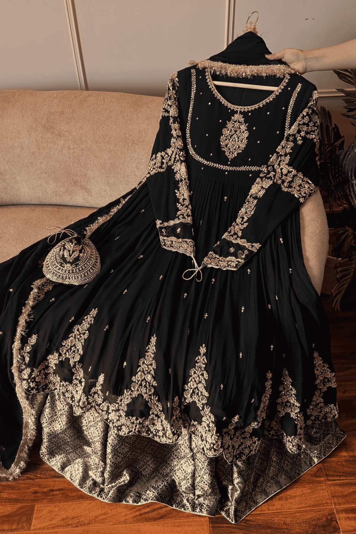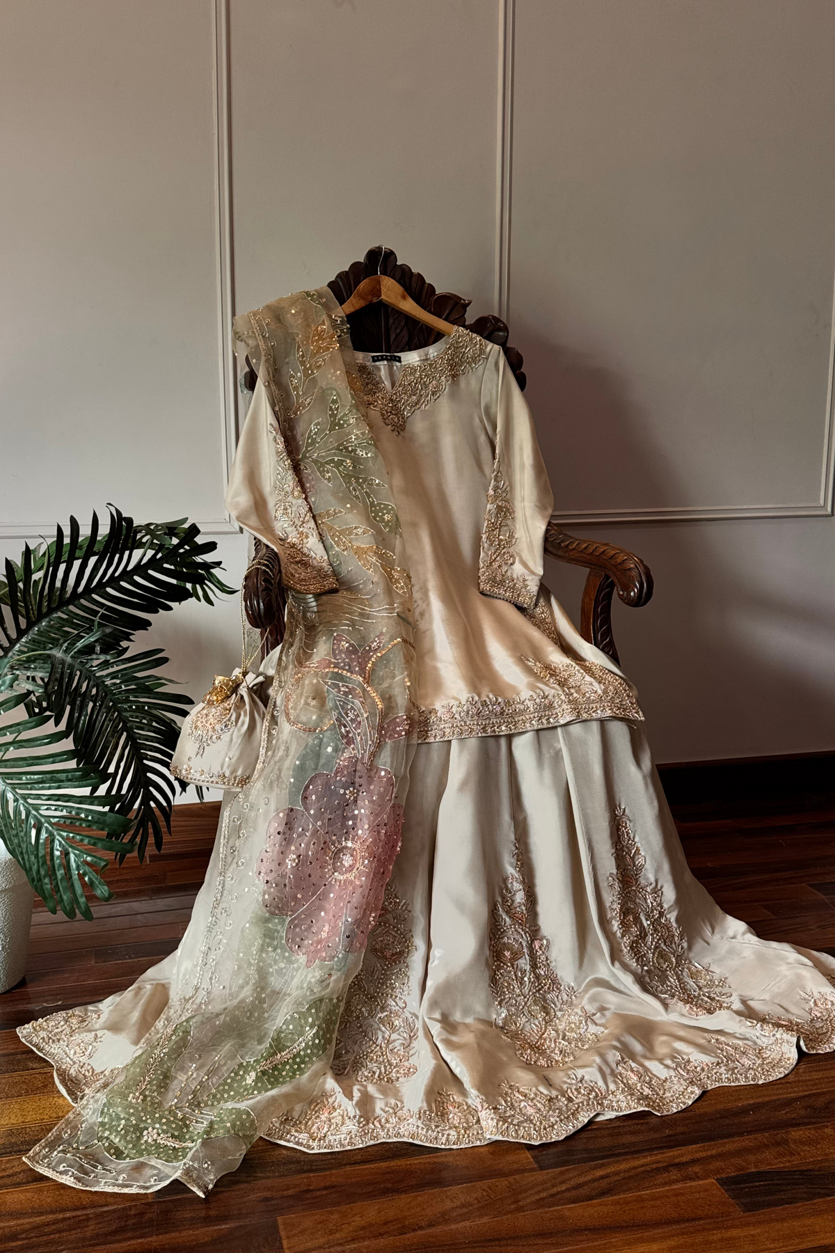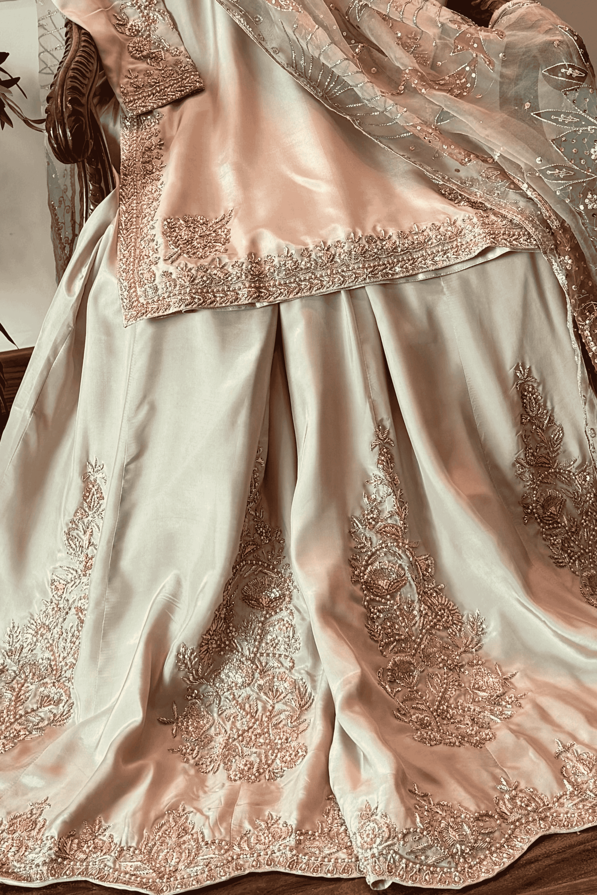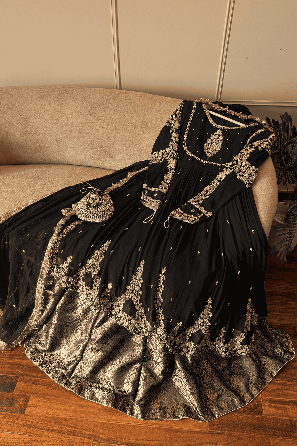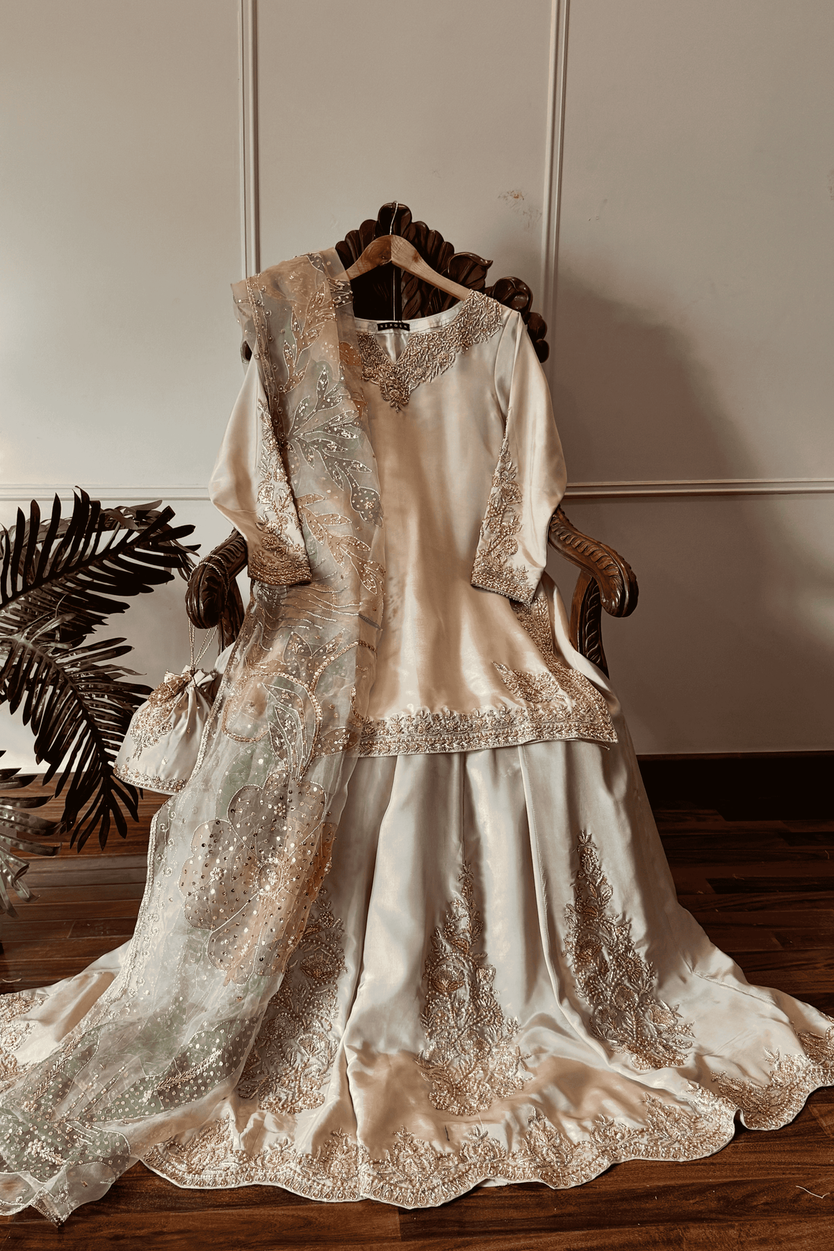 Perfect for a Nikkah ceremony, Moonlight Serenity embodies sophistication, tradition, and subtle grandeur—an ensemble designed for the bride who values timeless elegance and handcrafted luxury.
