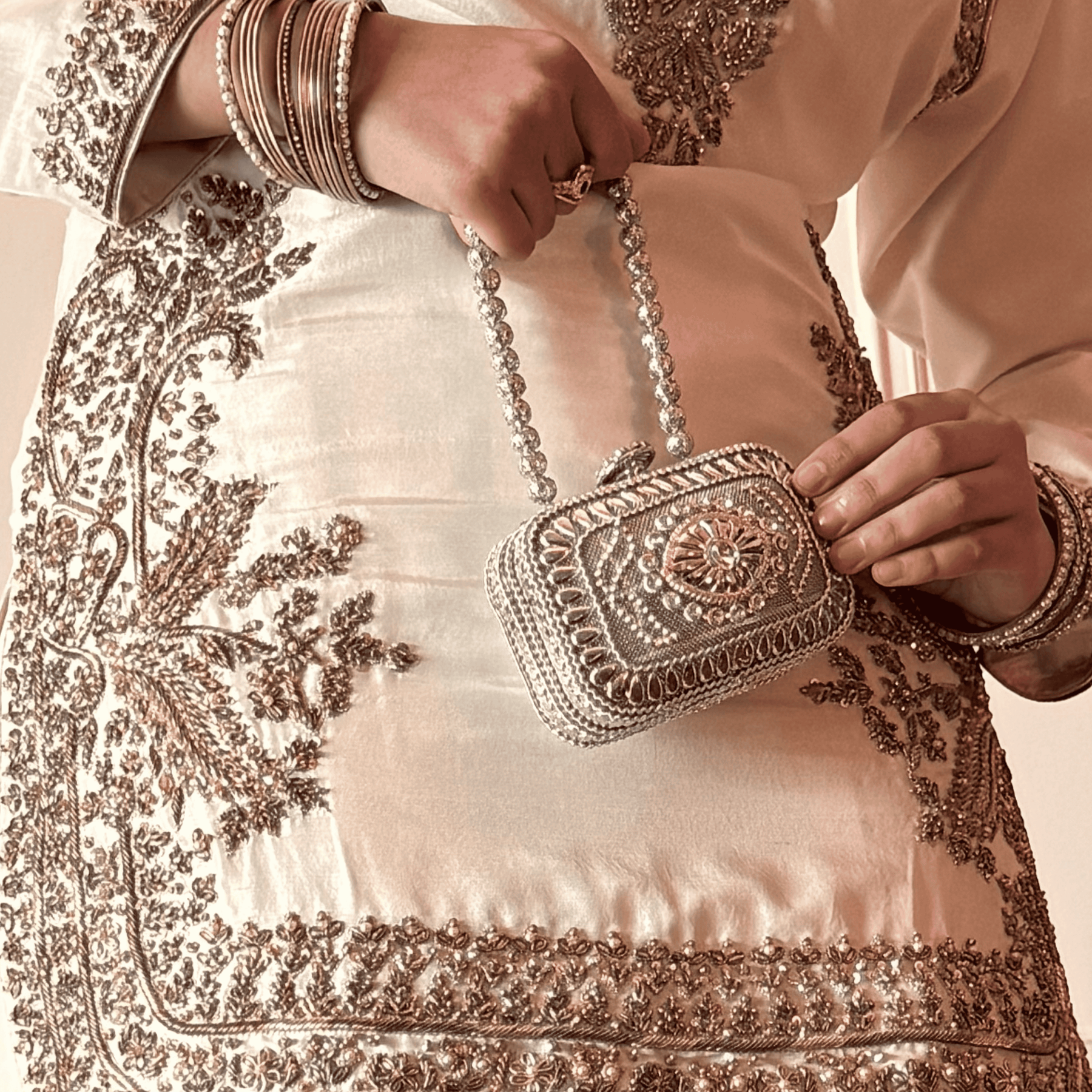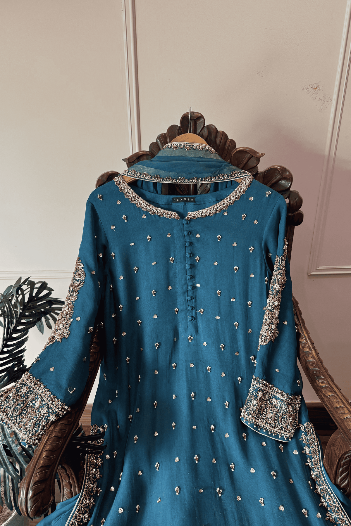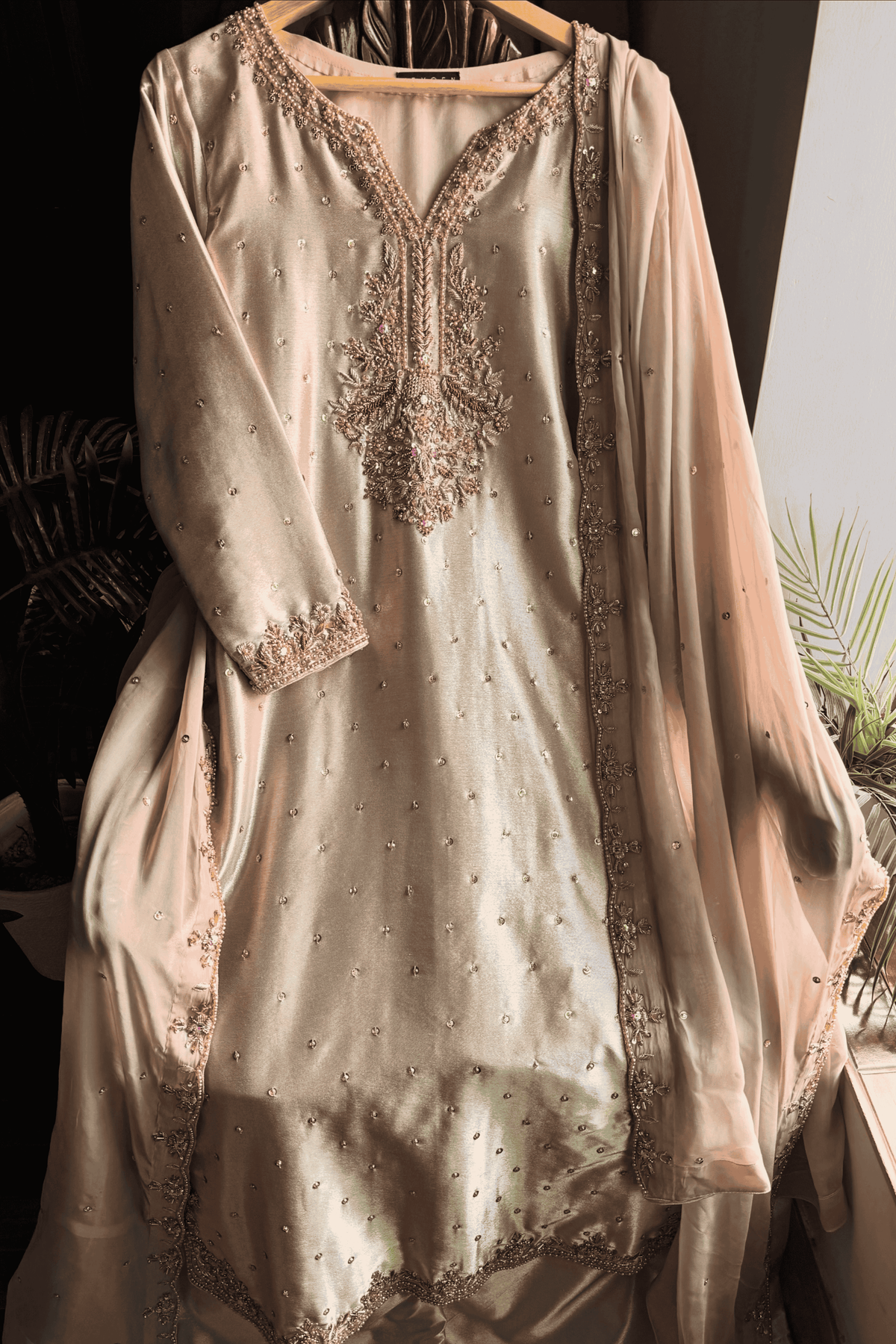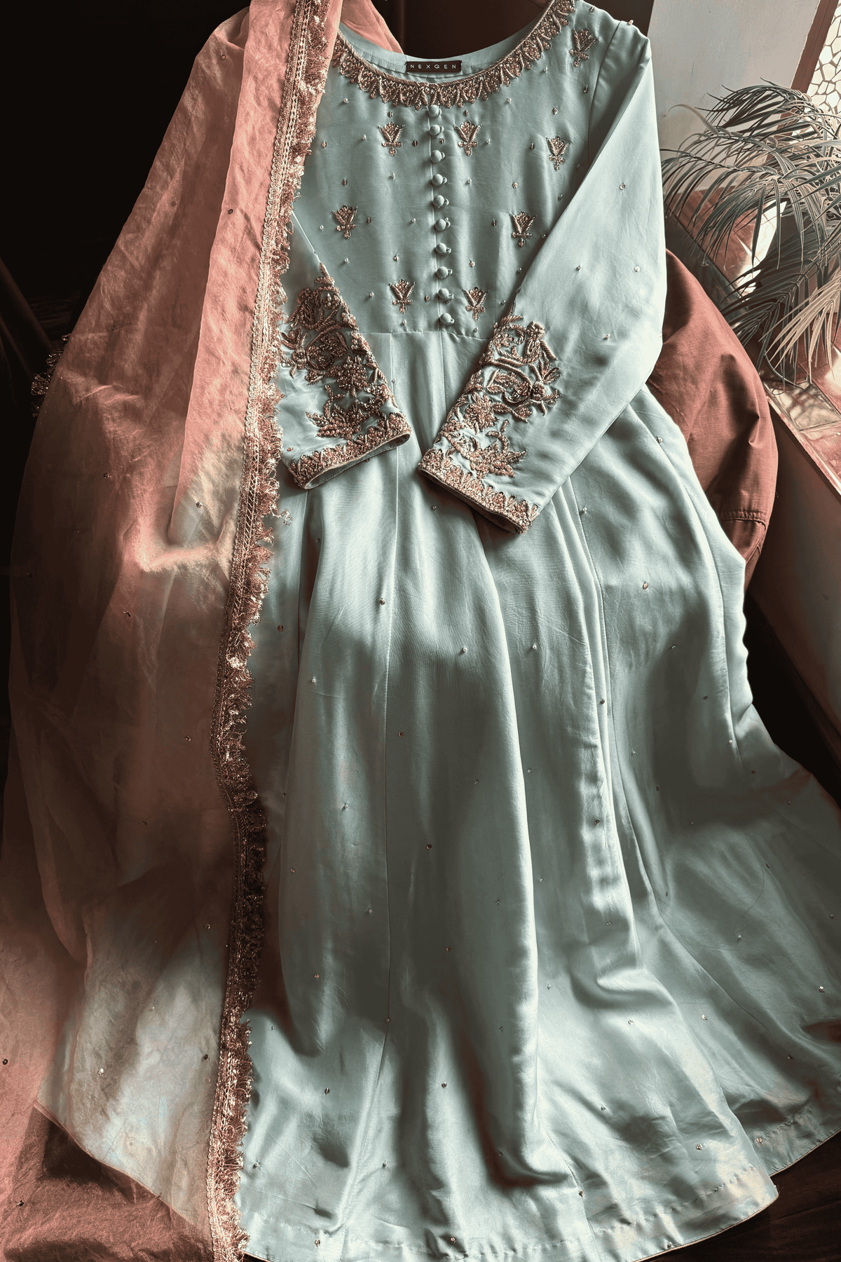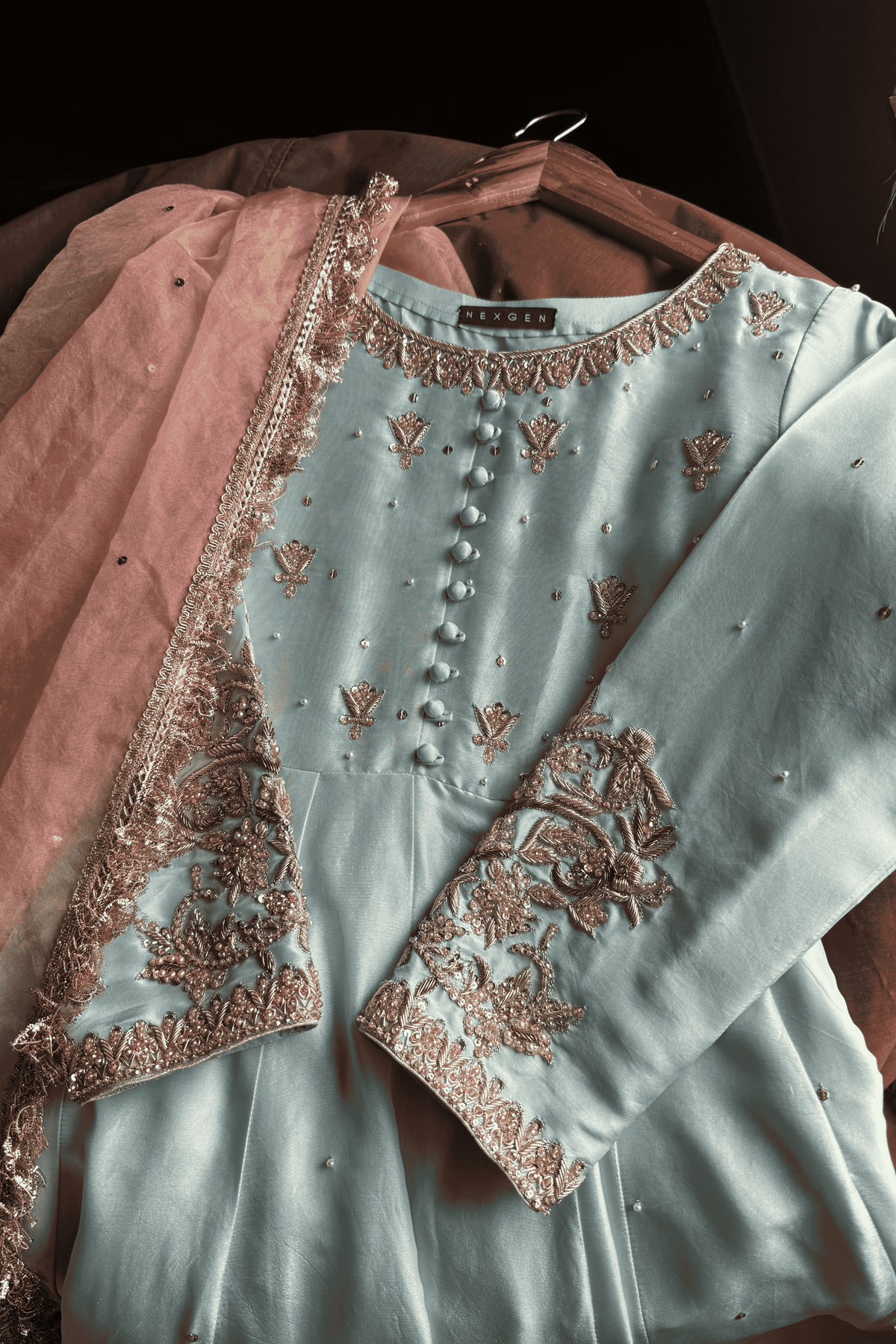 Perfect for a Nikkah ceremony, Moonlight Serenity embodies sophistication, tradition, and subtle grandeur—an ensemble designed for the bride who values timeless elegance and handcrafted luxury.