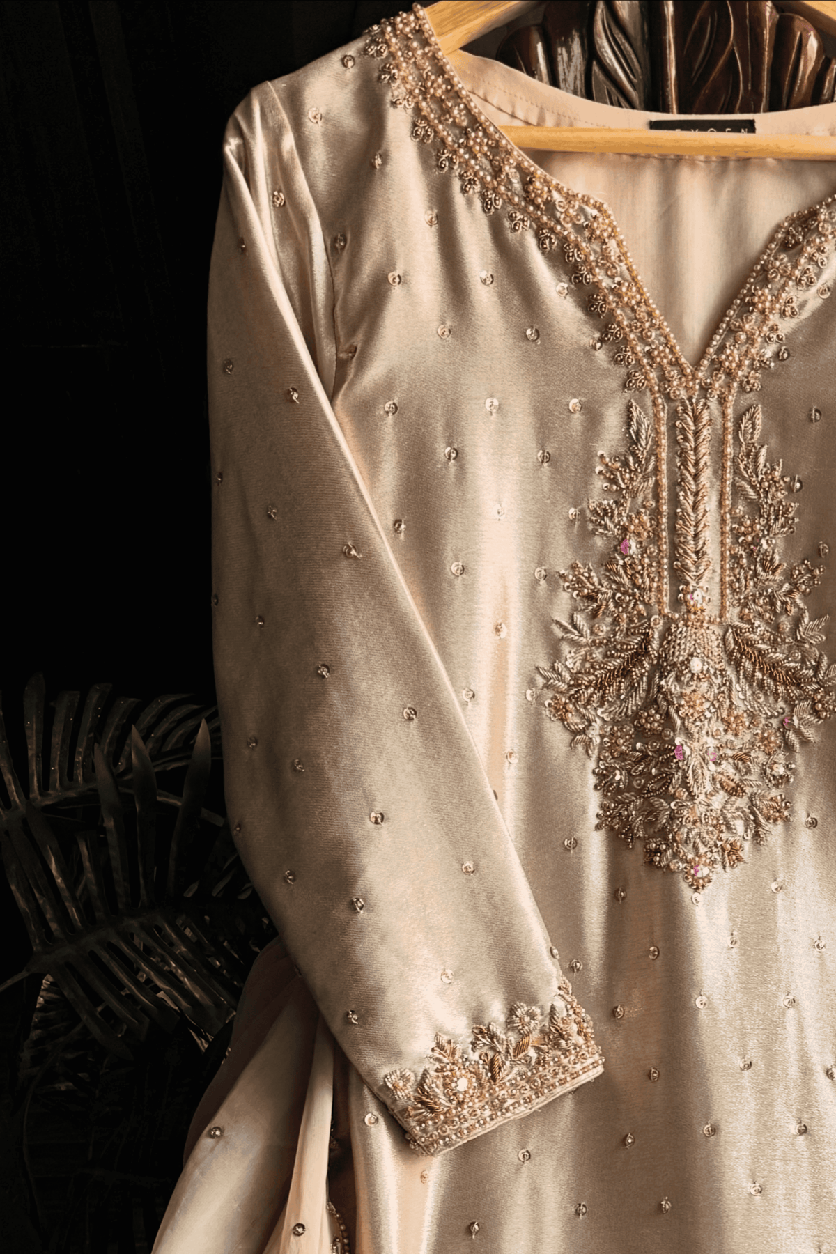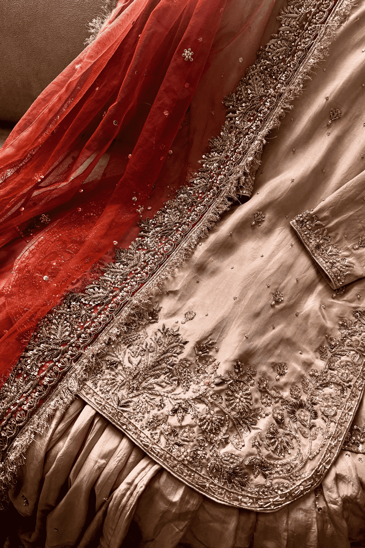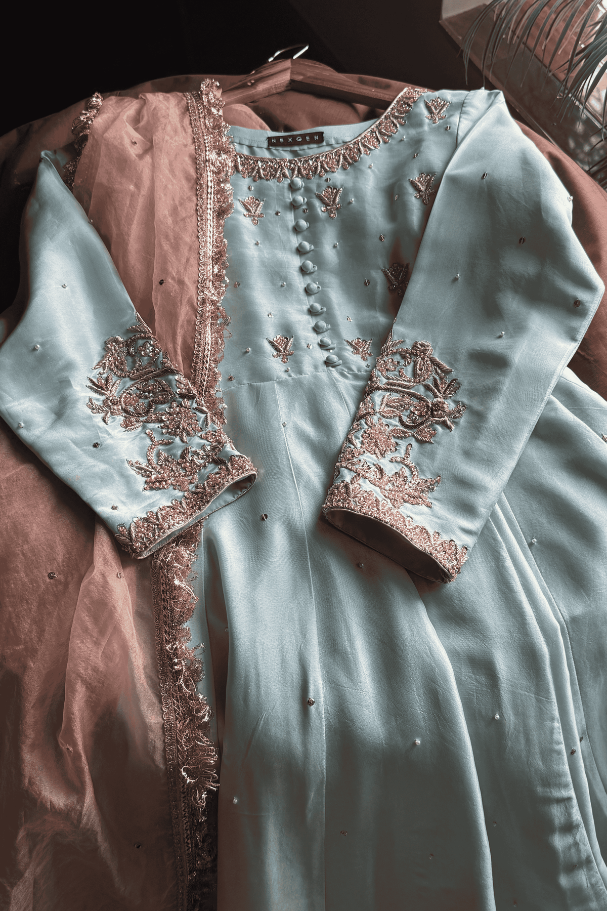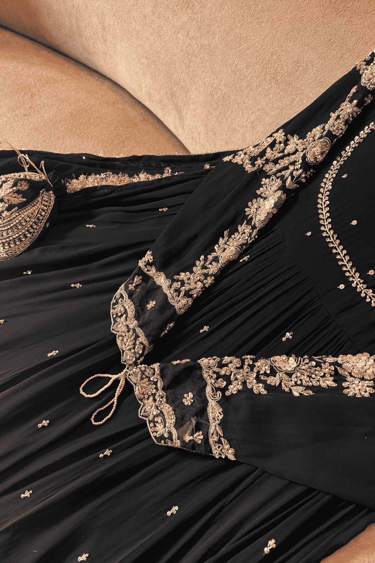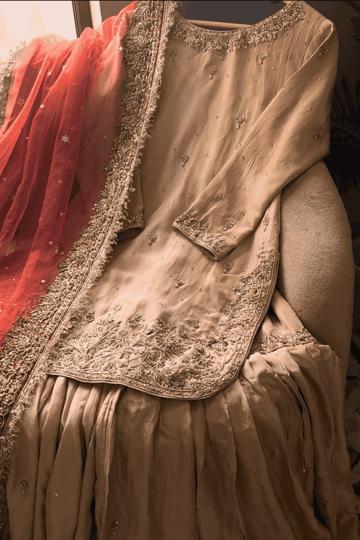 Perfect for a Nikkah ceremony, Moonlight Serenity embodies sophistication, tradition, and subtle grandeur—an ensemble designed for the bride who values timeless elegance and handcrafted luxury.