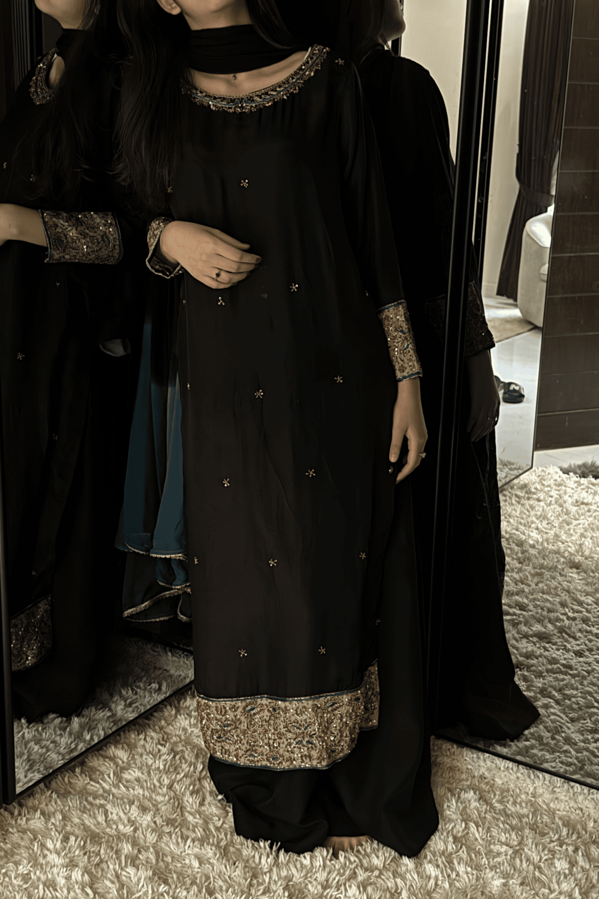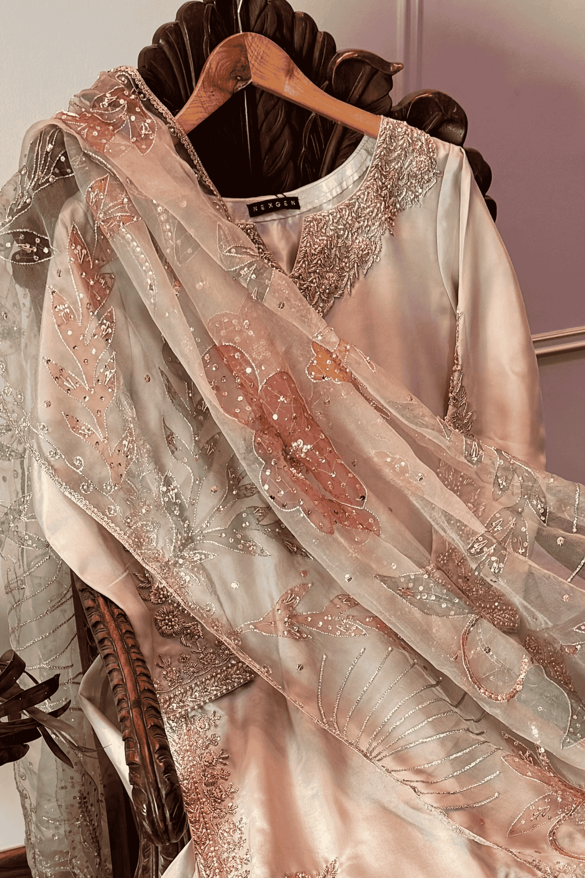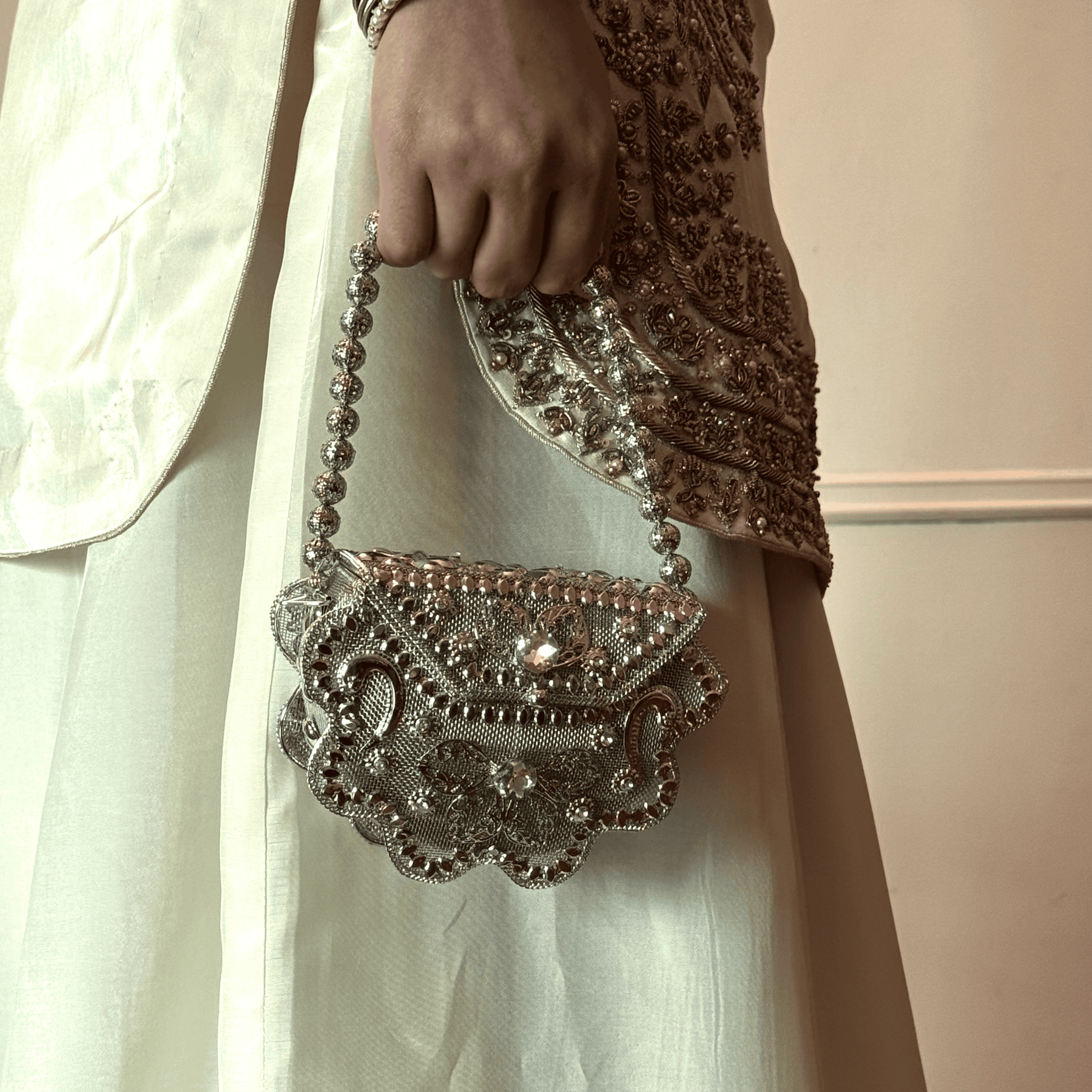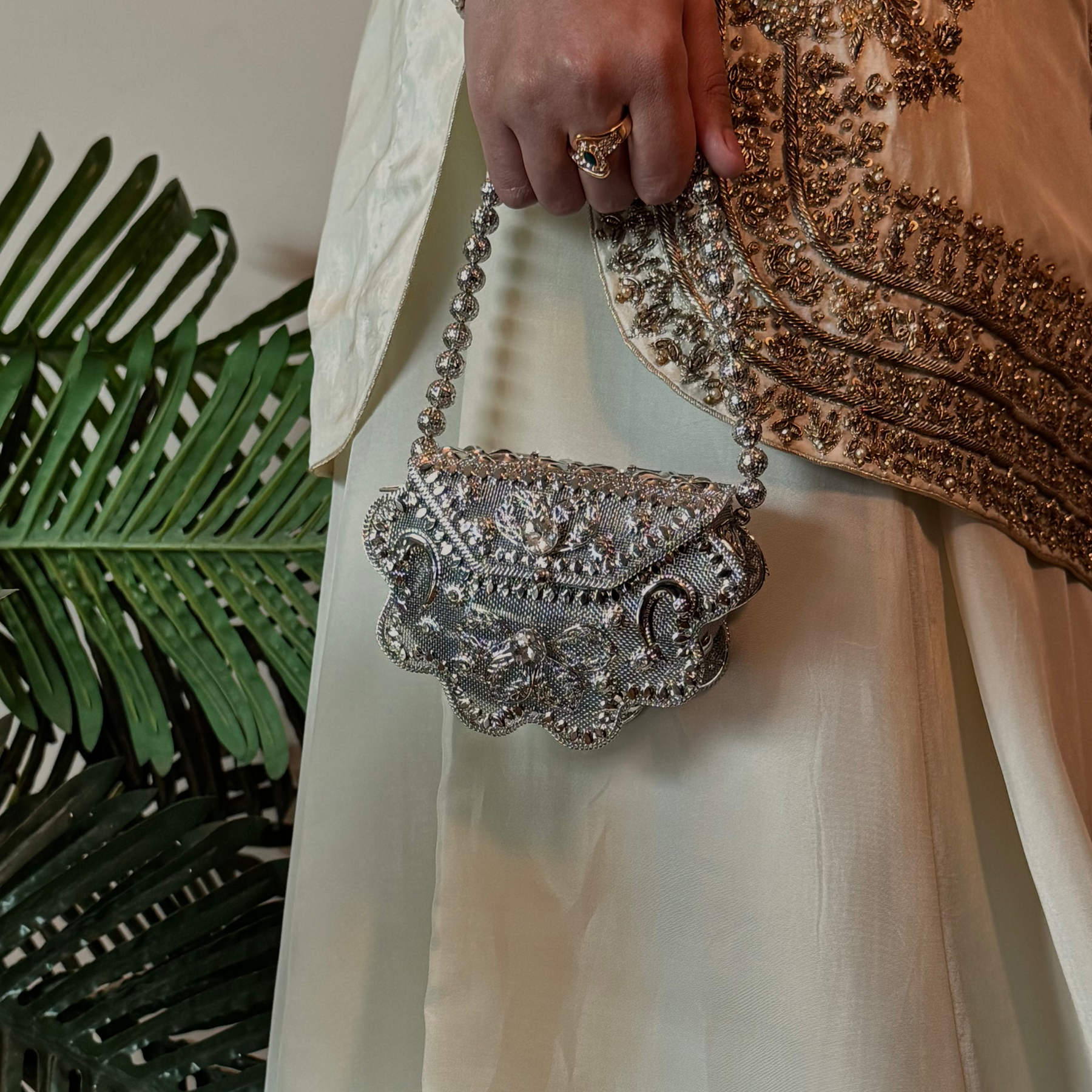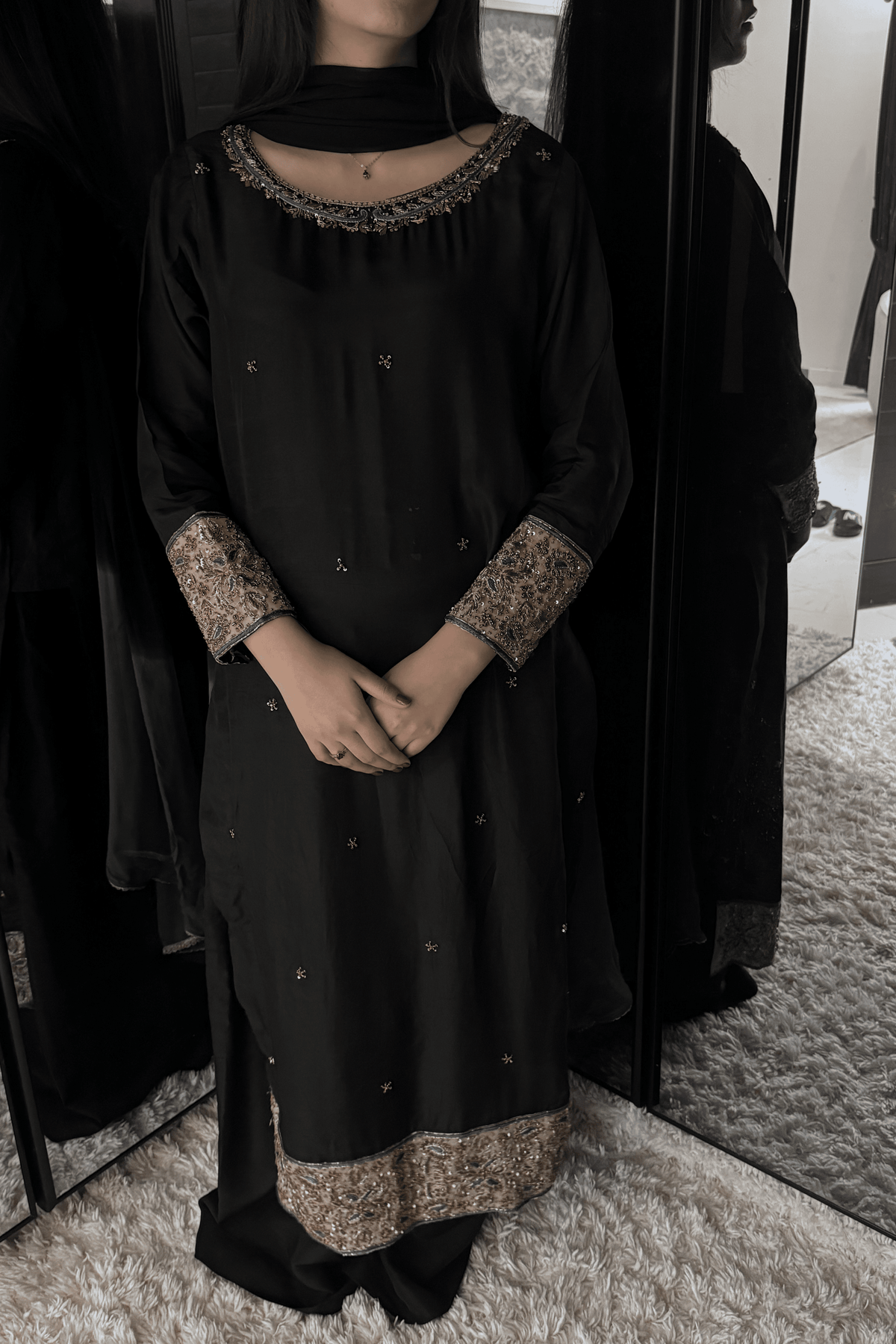 Perfect for a Nikkah ceremony, Moonlight Serenity embodies sophistication, tradition, and subtle grandeur—an ensemble designed for the bride who values timeless elegance and handcrafted luxury.