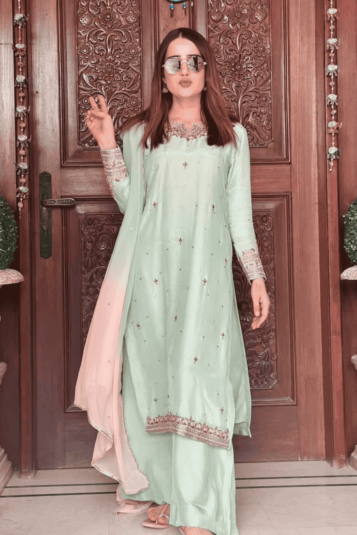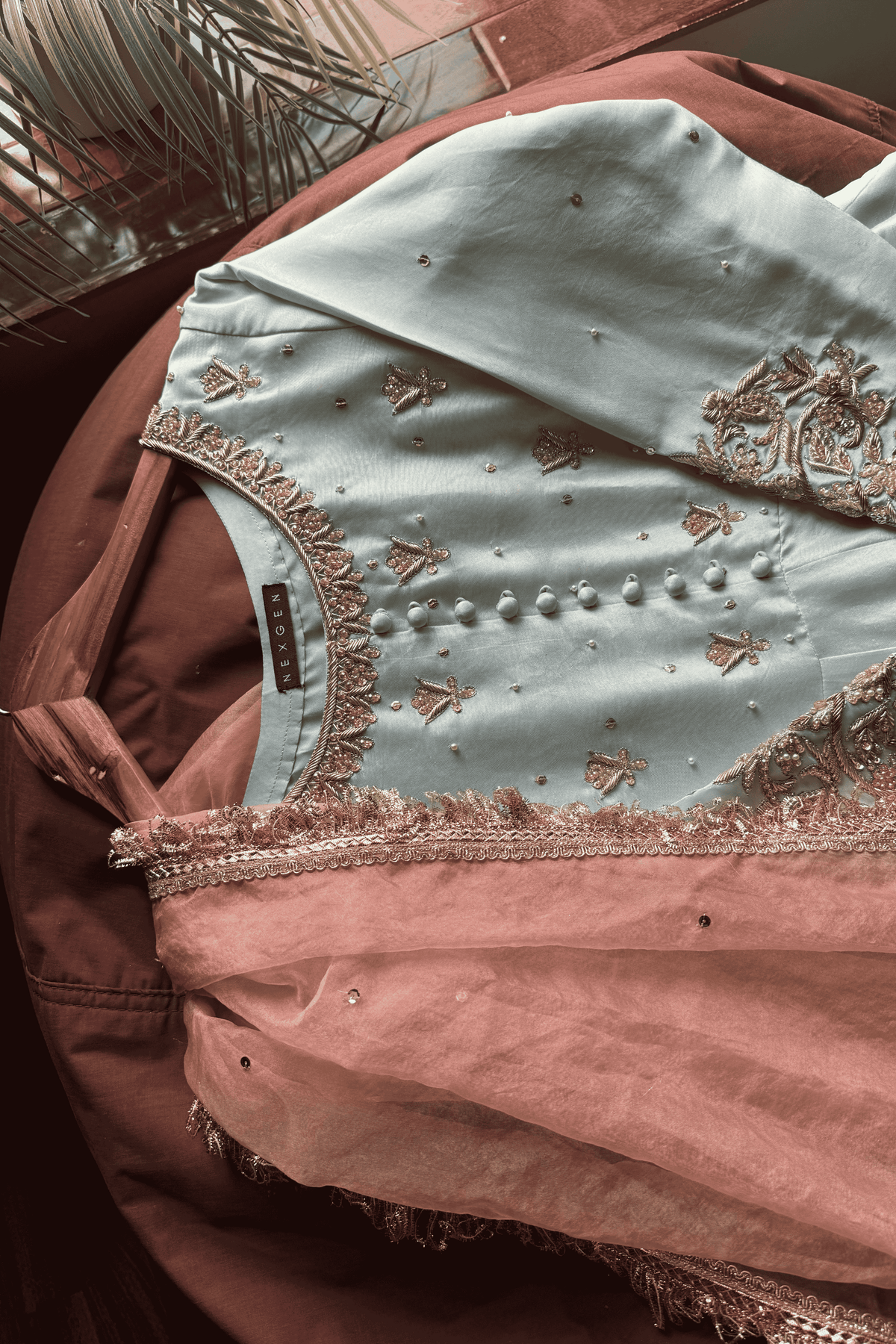 Completing the look is a dreamy dupatta in a soft blush tint on Pure Organza fabric, framed with hand-stitched borders featuring zardozi and kiran-inspired finishing. The delicate floral motifs and stonework elevate its charm, adding a whisper of color while maintaining the ensemble’s serene, moonlit aura.