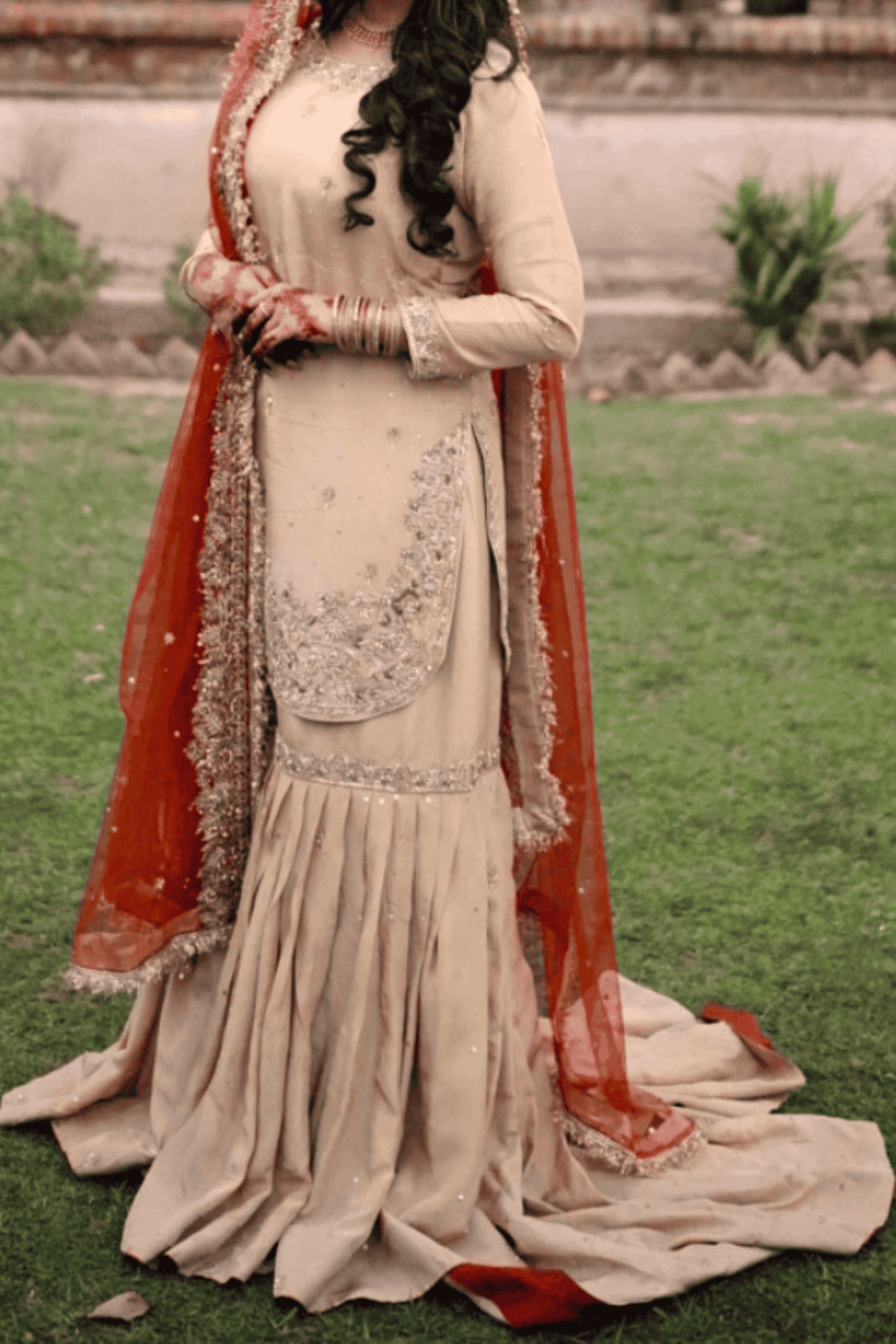 Moonlight Serenity is an ethereal bridal Nikkah gharara, crafted in soft ivory tones that radiate purity and timeless grace. This exquisite ensemble is adorned with the finest handwork—featuring zardozi, dabka, tilla, moti, pearls, beads, sequins, and delicate resham embroidery—each detail meticulously placed to create a luminous, heirloom-worthy bridal look.