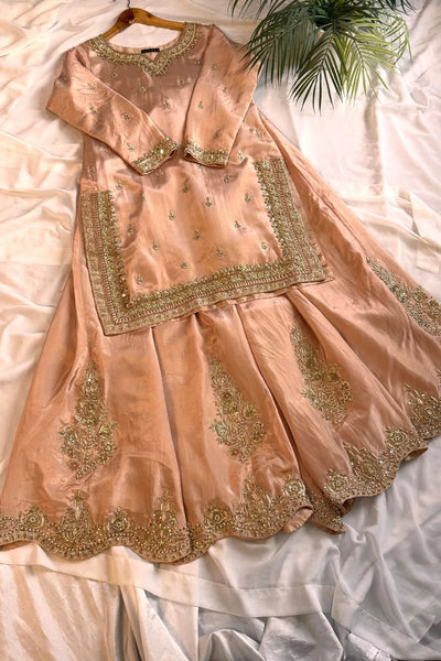 The striking contrast of the dull gold dupatta perfectly complements the outfit, featuring a four-sided zardozi border and finished with kiran lace appliqué, tying the entire outfit together. This ensemble is a true testament to luxury and tradition, making it a splendid choice for any ceremonial celebration.