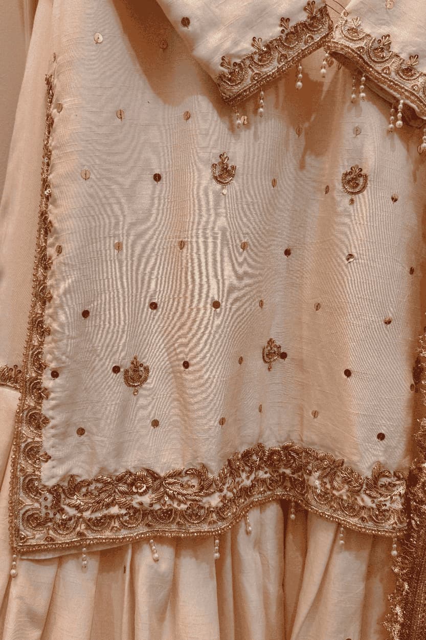 Moonlight Serenity is an ethereal bridal Nikkah gharara, crafted in soft ivory tones that radiate purity and timeless grace. This exquisite ensemble is adorned with the finest handwork—featuring zardozi, dabka, tilla, moti, pearls, beads, sequins, and delicate resham embroidery—each detail meticulously placed to create a luminous, heirloom-worthy bridal look.
